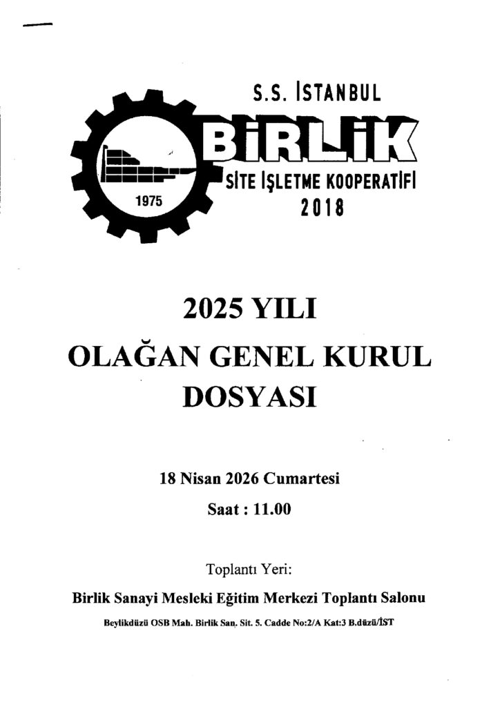 HABERLER DEPREM BÖLGESİ PREFABRİK SANAYİ SİTESİ GÖRÜNTÜLERİ … 24 Nis 2023 DEPREM YARDIMI *ŞİMDİ BİRLİK OLMA ZAMANI* “Deprem yaralarını birlikte saralım” Değerli Birlik Sanayi… 10 Şub 2023 Türk ve dünya tarihine adını altın harflerle yazdıran büyük bir… 11 Kas 2022 2021 Yılı olağan genel kurulumuz 14 Mayıs 2022 Cumartesi günü… 16 May 2022 DUYURULAR 2026 ARSA METREKARE BİRİM DEĞERLENDİRME TESPİTİ HK. İtiraz Dilekçesini indirmek için… 1 Eyl 2025 KİMYASALLAR YÖNETİMİ HK.… 8 May 2023 DEPREM YARDIMI *ŞİMDİ BİRLİK OLMA ZAMANI* “Deprem yaralarını birlikte saralım” Değerli Birlik Sanayi… 10 Şub 2023 10 KASIM ATATÜRK'Ü ANMA PROGRAMI… 9 Kas 2022 SAYFALAR ANASAYFA SİTE HAKKINDA HAKKIMIZDA YÖNETİM KURULU DENETİM KURULU SİTE YÖNETİM PLANI VERGİ DAİRESİ BİLGİLERİMİZ BANKA BİLGİLERİMİZ ÖNEMLİ TELEFONLAR GALERİ FİRMALAR HABER&DUYURU HABERLER DUYURULAR İLANLAR SATILIK İLANLARI KİRALIK İLANLARI İŞ İLANLARI ALT YAPI İLETİŞİM